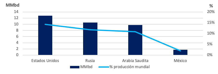 A finales de 2019, México produjo 1.75 millones de barriles diarios (MMbd) de petróleo crudo, de los cuales casi el 70% fue producto de exportación. Con estas cifras, nuestro país está entre los primeros 12 lugares a nivel mundial en producción y exportación del hidrocarburo. No obstante, estamos lejos de ser una potencia en este mercado.